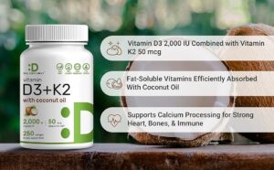- Special Features – Extra strength vitamin D3 with K2 sunshine vitamin complex, essential fat-soluble vitamins D3 as cholecalciferol and K2 in its superior menaquinone MK7 form, healthy coconut oil liquid carrier that is designed for max absorption.