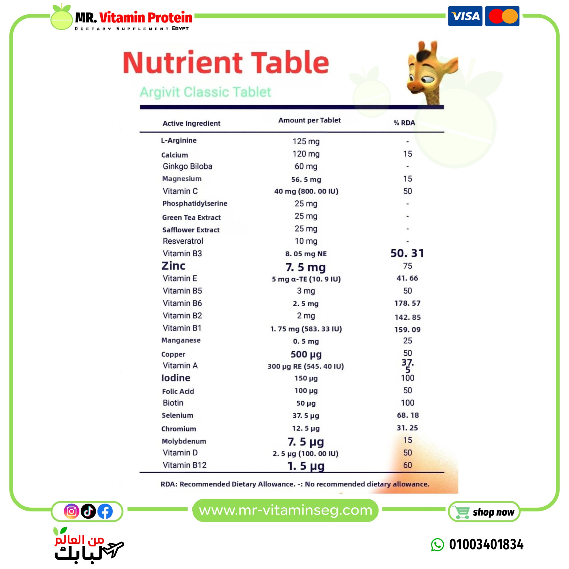 مكمل غذائي متكامل يحتوي على مزيج متوازن من الفيتامينات والمعادن والأحماض الأمينية لدعم النمو والطاقة والصحة العامة. تم تصميم تركيبة Argivit Classic لدعم احتياجات الجسم الغذائية لدى الأطفال من عمر 11 سنة فأكثر والمراهقين والبالغين، خاصة خلال فترات النمو أو النشاط الذهني والبدني.